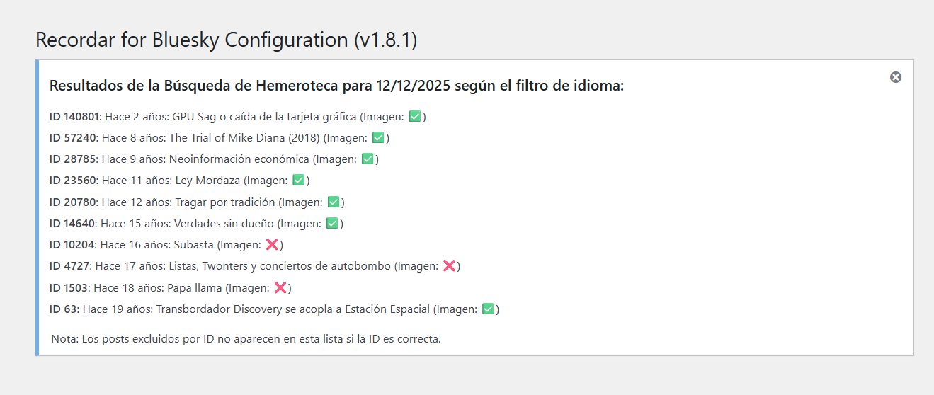 Recordar for Bluesky & Mastodon is a plugin designed to automate the publication of archive content (ephemeris/on this day) to Bluesky and Mastodon.